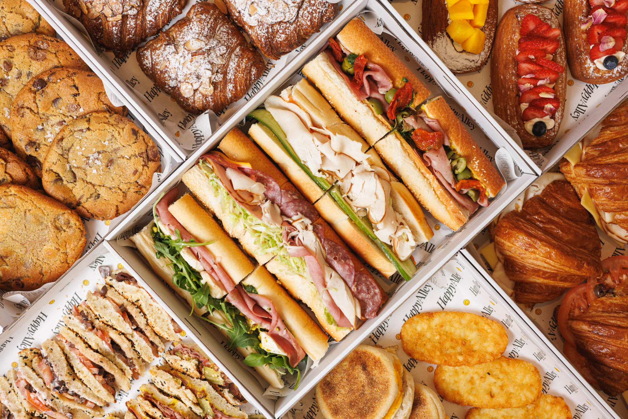 Freshly made sandwiches, pastries, and treats, stacked to impress.