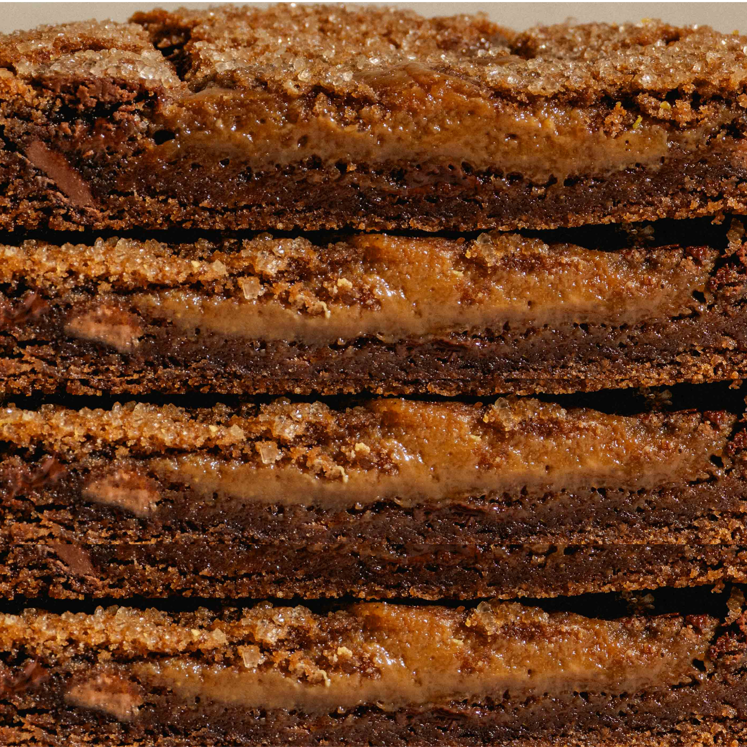 LIMITED DROP: Chocolate‑coffee cookie filled with hazelnut and espresso, coated in raw sugar for that perfect crunch.